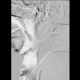 La angiotomografía reveló una obstrucción completa de la arteria carótida interna derecha y una obstrucción de 70% de la contralateral, en la angiografía cerebral se confirmó la obstrucción de la carótida interna izquierda de 85% con una buena colateralidad dada por el sistema vértebro-basilar (figura 1). Estos hallazgos sugirieron ataques isquémicos transitorios manifestados como síndrome de limb-shaking.