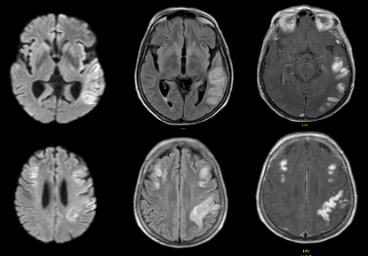 Se toma resonancia cerebral simple y con contraste con hallazgos de restricción a la difusión de predominio cortical temporoparietal bilateral, principalmente izquierdo, con extensión a insula izquierda, también representado como lesiones hiperintensas en FLAIR/T2 y con realce al contraste (Figura 1).
